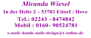 Herzlich Willkommen auf meiner Internetseite!Gepflegte Hände und schöne Fingernägel sind die Visitenkarte jeder modernen und selbstbewußten Frau! Perfekte Fingernägel sind jedoch nur in seltenen Fällen von Natur aus gegeben. Professionelle Hand-/Nagelpflege sowie typgerechte Nagelmodellagen, Naturnagelverstärkung oder auch “Nagelbeisserbehandlungen” sind hier die Lösung. Grundvoraussetzung für ausgezeichnete Ergebnisse sind jedoch Fachkenntnisse, ausreichend Zeit für die Beratung und Ausführung sowie die Nutzung hochwertiger Produkte.Ich verwende weitestgehend Produkte des international führenden Herstellers LCN. Diese Materialien sind sehr gut verträglich, da es sich hier um modernste Materialien auf Basis der Dentalmedizin handelt.Sie geniessen zudem ruhige und private Atmosphäre und können sich auf die Einhaltung höchster Hygienestandards verlassen. Wenn Sie Fragen haben oder einen Termin vereinbaren möchten, so rufen Sie mich einfach an. Mein Ziel ist es, Sie rundum zufrieden zu stellen. Dafür nehme ich mir gerne Zeit für Sie! Ich freue mich schon jetzt auf Ihren Besuch!Miranda WieselNagelmodellage und Handpflege